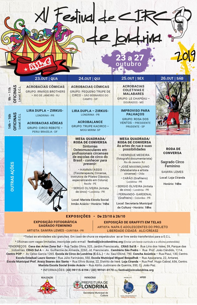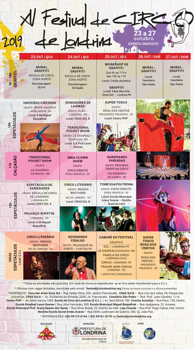 Começa nesta quarta feira 23 de outubro o XV Festival de Circo de Londrina, espetaculos, oficinas, murais de graffiti, mesas tematicas e muito mais. Acompanhe nossa programação e não fique de fora deste festival.